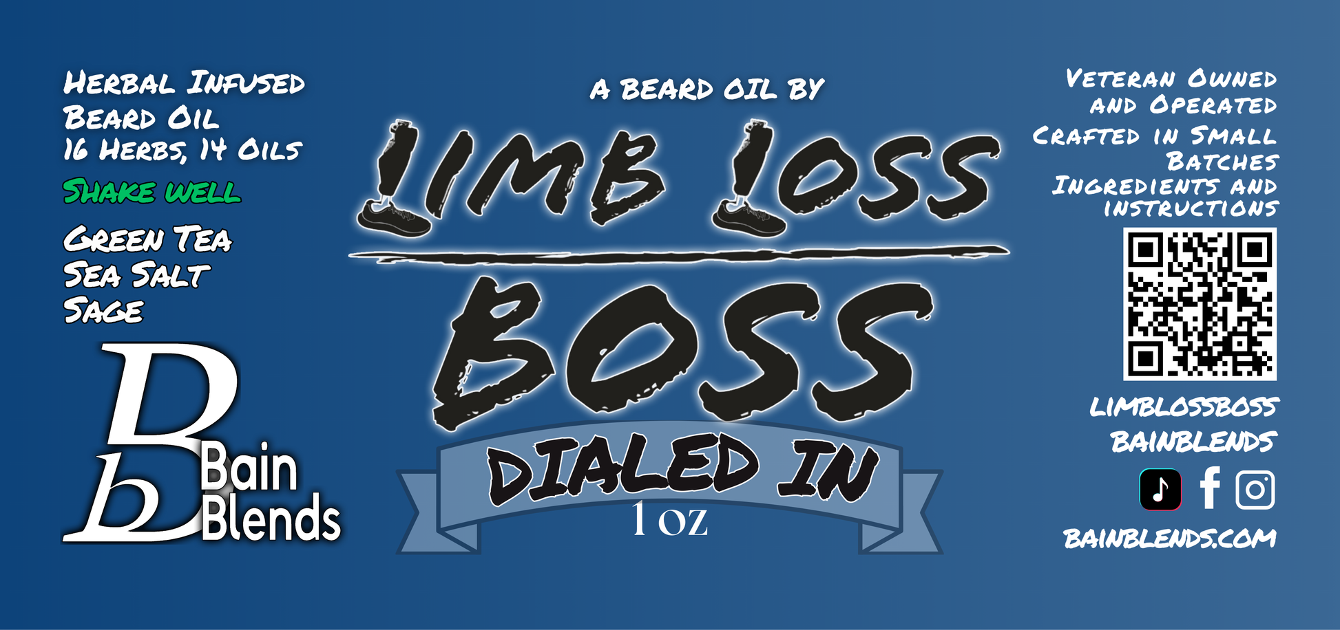 Limb Loss Boss and Bain Blends present Dialed In. This 1 oz beard oil blend designed for the working man who demands freshness and reliability throughout the day. Combining green tea, sea salt, and sage, this scent offers more than just a pleasant aroma—it delivers natural odor control and skin protection. Green tea provides a clean, antioxidant-rich scent that promotes skin health, while sea salt adds purifying minerals to keep you feeling fresh and balanced. Sage contributes an herbaceous, sharp aroma known for supporting healthy body odor. Together, these ingredients create a precise, natural fragrance that keeps you dialed in no matter the challenge.